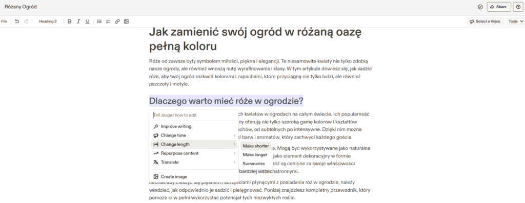Możesz także korzystać z wszystkich funkcji Ask Jasper, czyli zaznaczać fragmenty swojego tekstu, aby zmienić ton wypowiedzi, czy ulepszyć treść.