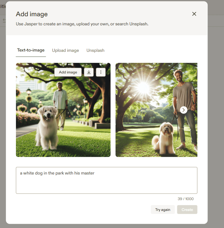 Jasper AI jest dodatkowo wyposażony w funkcję generowania obrazków AI. Wystarczy tylko wpsiać komendę, a program utworzy nam kilka wersji obrazów.