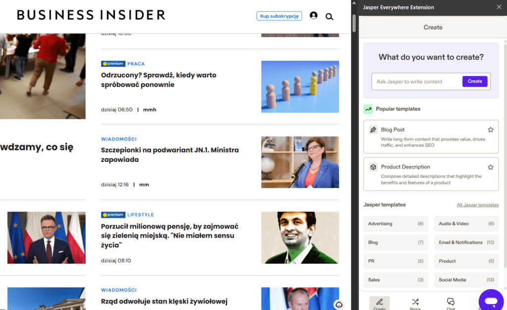 Warto również zainstalować rozszerzenie Jasper AI do przeglądarki. Dzięki niemu będziemy mogli korzystać z możliwości Jasper AI na dowolnej stronie, bez konieczności osobnego wchodzenia na stronę Jasper AI.