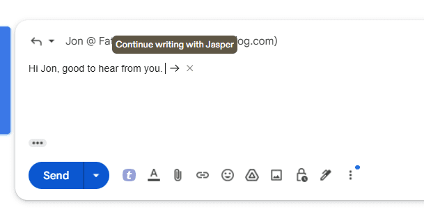 Drugim sposobem jest wykorzystanie Jasper AI podczas stron, gdzie piszesz teksty, np. na blogu, czy w skrzynce e-mail. Jeśli nie masz pomysłu na treść, możesz poprosić Jasper AI, aby pisał dalej za ciebie.