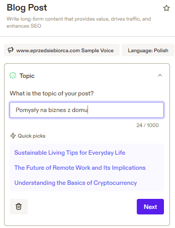 Przy swoich tekstach Jasper AI będzie starał się pisać właśnie w takim stylu. Muszę przyznać, że czytając generowane treści z głosem mojej marki, mam wrażenie, jakbym sam pisał te artykuły. Oczywiście nie odzwierciedlają one mojego stylu 1 do 1, jednak są bardzo podobne.