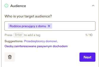 Po temacie wybieramy grupę docelową, która ma przeczytać ten artykuł. Możemy wprowadzić ją samodzielnie, oraz wybrać z podpowiedzi. Możemy wybrać do 10 grup docelowych.