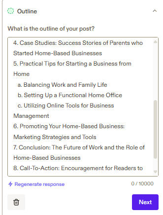 Następnie zostaniemy poproszeni o stworzenie szkicu tekstu, czyli nagłówków. Możemy wymyślić je sami, bądź kliknąć w fioletowy napis „Generate response”, aby sztuczna inteligencja zrobiła to za nas. Wybiorę tę drugą opcję. Nagłówki wygenerują się po angielsku, ale w tekście będą one po polsku.