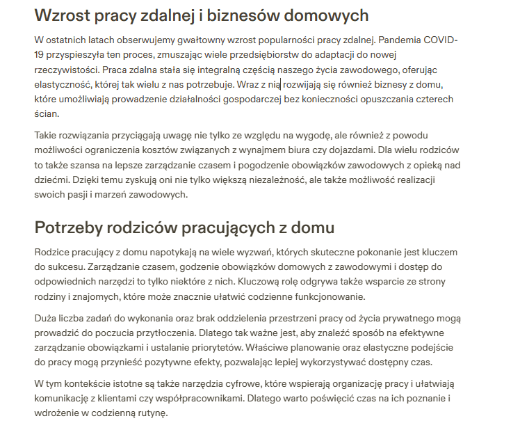 Tekst jest napisany w przystępny sposób, zawiera logiczne argumenty i dobrze rozwija temat pracy z domu oraz prowadzenia biznesu. Jest łatwy do zrozumienia, i ma dobrze ułożoną strukturę- wprowadzenie, rozwinięcie i zakończenie. Pisany jest w stylu, który odpowiada mojej marce.