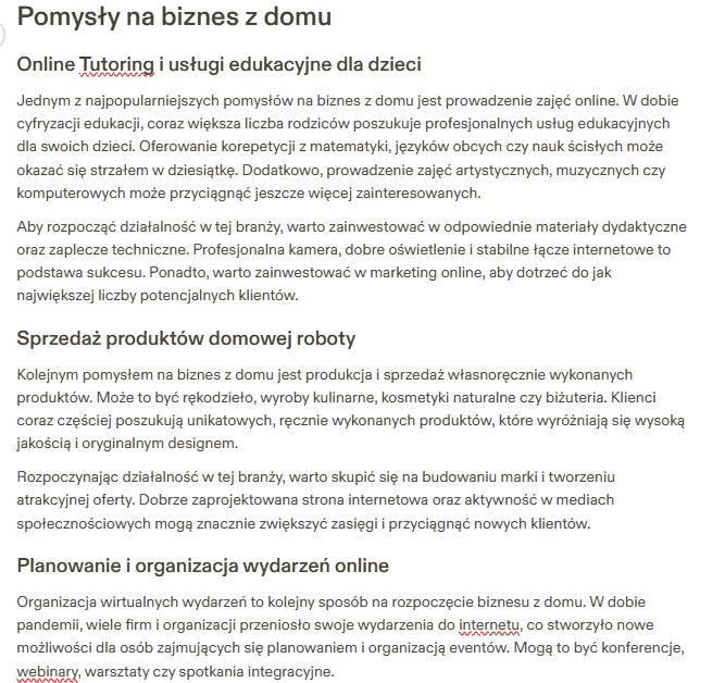 Jasper AI wymienił konkretne pomysły na biznes z domu, jednak moim zdaniem ich oryginalność pozostawia trochę do życzenia. Tekst jest poprawny, ale momentami może sprawiać wrażenie nieco zbyt formalnego. W artykułach dotyczących praktycznych porad, zwłaszcza dla rodziców, lżejszy, bardziej rozmowny styl mógłby przyciągnąć większą uwagę.