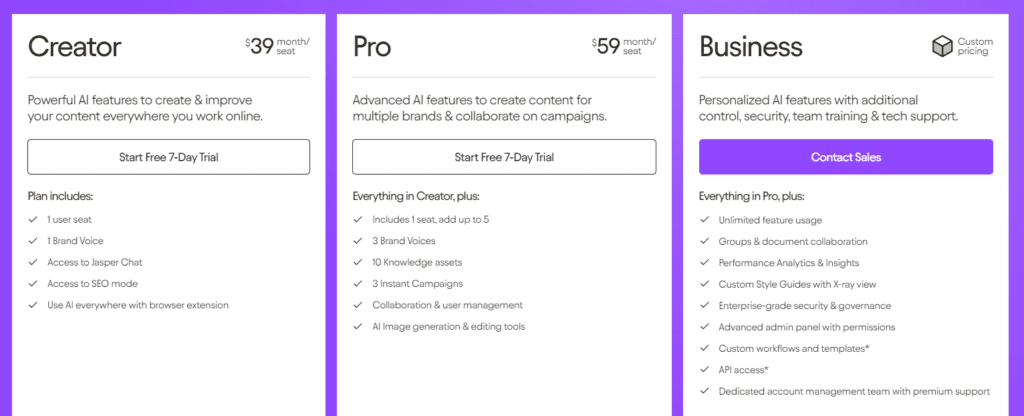 Jego najtańszy pakiet Creator to koszt $39/mies. w rozliczeniu z góry za rok, lub $49, jeśli płacisz co miesiąc. W tym planie są pewne ograniczenia, jak np. tylko 1 głos marki, brak możliwości generowania obrazów, oraz brak funkcji zespołowych.
