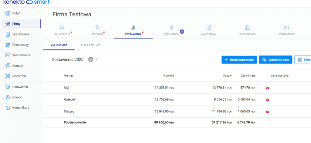 Na podstawie zaksięgowanych przez ciebie dokumentów w programie księgowym, w KonektoSmart dla każdego klienta generują się dane, takie jak zestawienia, wysokość podatków, czy wysokość składek ZUS.