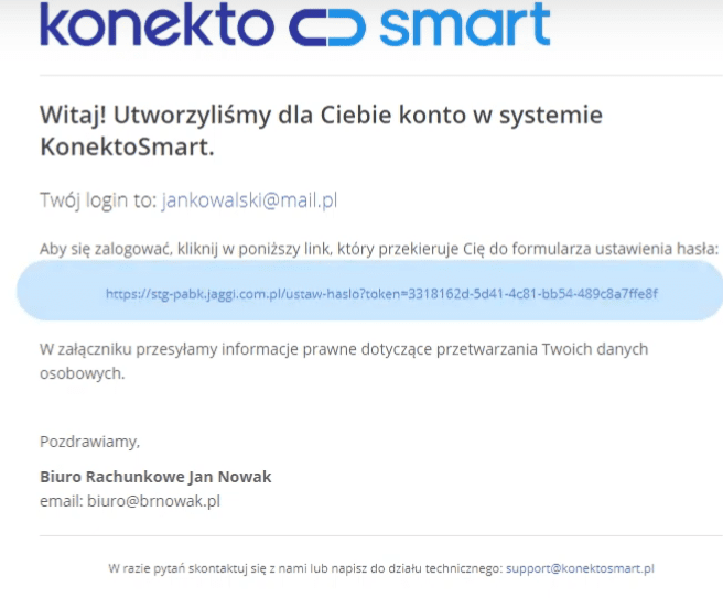 Po utworzeniu konta, klient otrzyma e-mail z linkiem do utworzenia hasła do swojego konta.