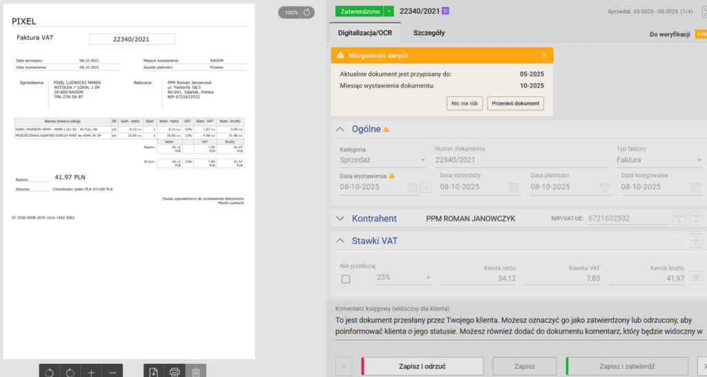 Klient twojego biura może załączać zdjęcia faktur do panelu, a ty masz do nich natychmiastowy dostęp. Co więcej, KonektoSmart jest wyposażone w funkcję OCR. Oznacza to, że nie musisz ręcznie przepisywać danych z faktury. Odczytają się one automatycznie, dzięki czemu będziesz mógł je szybko wyeksportować i zaksięgować w programie księgowym.
