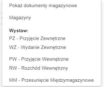 Pierwszą funkcją jest możliwość tworzenia dokumentów magazynowych. Możemy wystawiać tu najważniejsze dokumenty magazynowe, między innymi PZ, WZ, PW, RW, czy MM.