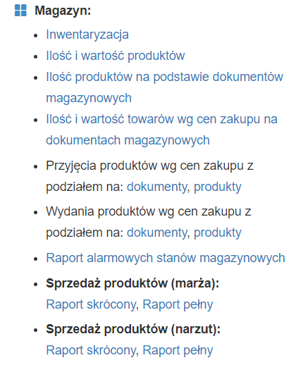 Ponadto dostępne są różne raporty magazynowe, takie jak ilość i wartość produktów, raport alarmowych stanów, oraz kilka innych.