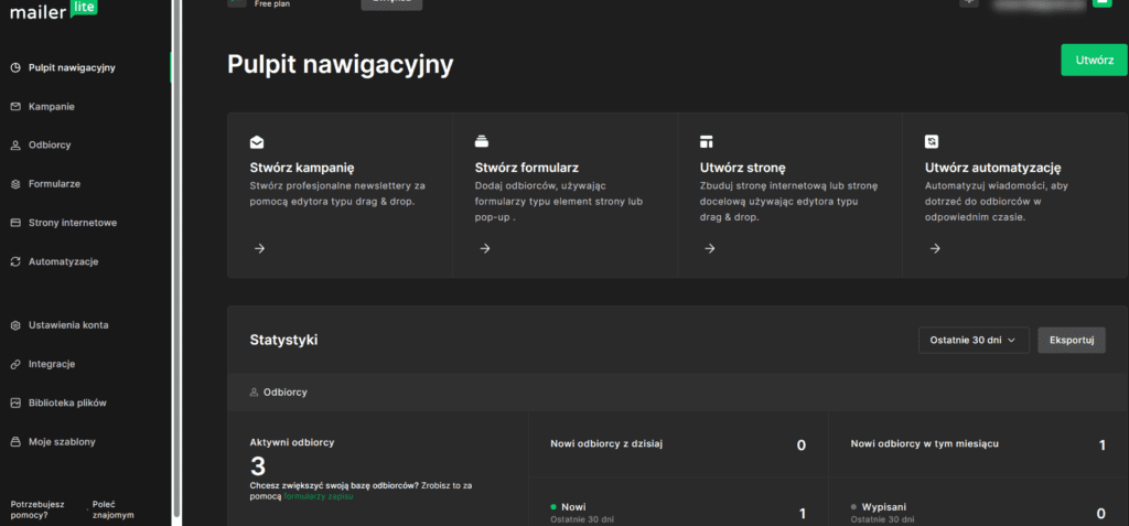 Narzędzie MailerLite jest rzeczywiście bardzo proste w użyciu. Pulpit główny wygląda tak jak poniżej i nie powinien on przerażać nawet początkujących. Po lewej stronie mamy menu główne a w centralnej części pulpit nawigacyjny z najważniejszymi skrótami i statystykami.