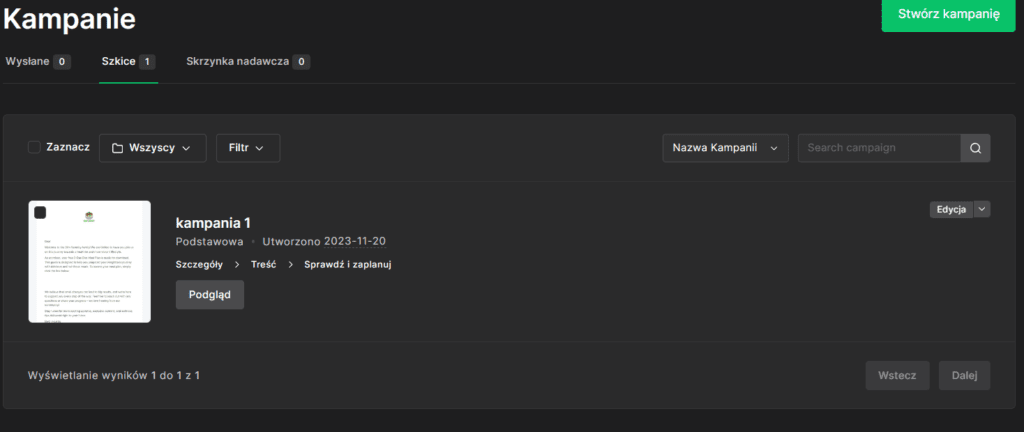 Pierwsza zakładka to „Kampanie”. Możemy tu tworzyć newslettery, czy split testy.