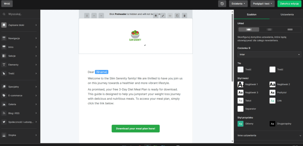 Podobnie jak w przypadku projektowania e-maila, tutaj również mamy prosty w obsłudze edytor, który pozwala nam na dowolne dostosowywanie elementów.