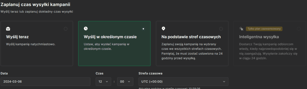 Na sam koniec ustawiamy kiedy chcemy wysłać kampanię. Oprócz wysyłki natychmiastowej, możemy ustawić konkretną godzinę, na podstawie strefy czasowej lub wysłać automatycznie o godzinie ze statystycznie największą szansą otwarcia wiadomości.