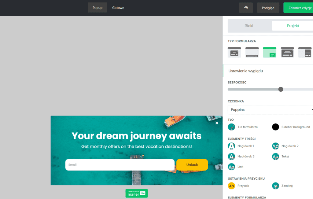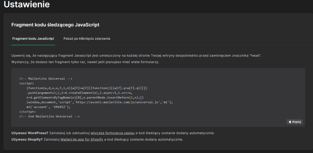 Po zakończonej edycji, ustawiamy jeszcze takie parametry, jak np. wyzwalacz, widoczność, czy częstotliwość, oraz kopiujemy kod z formularzem i wklejamy go na naszej stronie.