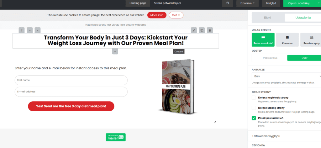 Możemy tworzyć podstrony, kategorie, menu i wiele innych. W teorii możemy stworzyć każdy rodzaj strony internetowej, jednak osobiście nie używałbym MailerLite do tego celu ze względu na ograniczone możliwości konfiguracyjne czy brak zaawansowanych ustawień SEO.