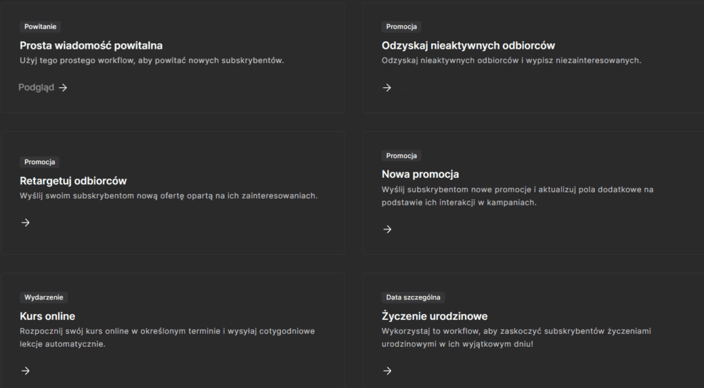 W zakładce niżej pod tytułem „automatyzacje” znajdziemy wszystko, co związane z automatycznym wysyłaniem sekwencji e-maili.