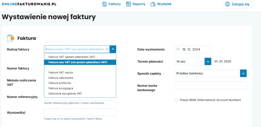 Na początku wybieramy rodzaj faktury. Większość danych, takich jak numer faktury, daty, oraz terminy będą ustawione automatycznie.