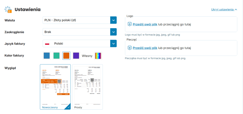 Możemy też wybrać od razu kolorystykę dokumentu, oraz układ. Po prawej stronie możemy dodać plik z logo naszej firmy i pieczęcią.