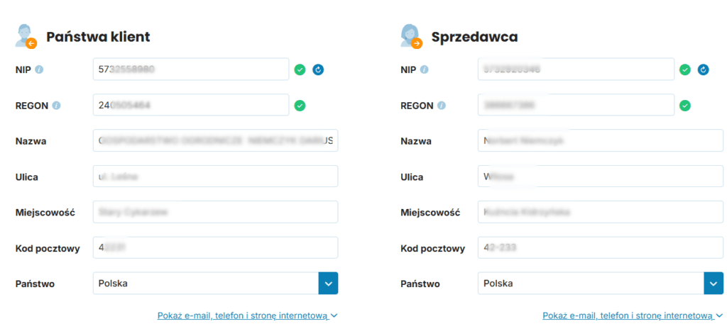 W kolejnym kroku mamy do wpisania dane klienta, oraz naszej firmy jako dane sprzedawcy. Nie ma tu zbyt dużo roboty, ponieważ wystarczy tylko wpisać NIP klienta, a reszta danych uzupełni się automatycznie, pobierając informacje z GUS. Fajna sprawa i działa to bardzo sprawnie.