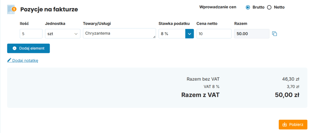 W ostatnim kroku wpisujemy czego dotyczy towar, wpisujemy ilość, stawkę podatku, a wszystko liczy się automatycznie. Istnieje możliwość zapisania towaru razem z ceną, by przy kolejnych fakturach po prostu wybrać go z listy.