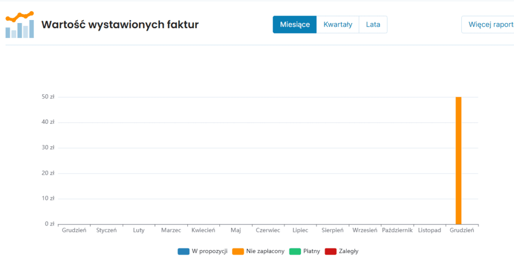 Finanse twojej firmy mogą być w jednym miejscu dzięki raportom. Znajdziemy tu ładnie graficzne statystki przychodów i wydatków, a także posortujemy nasze zarobki wg. klienta, czy towaru.