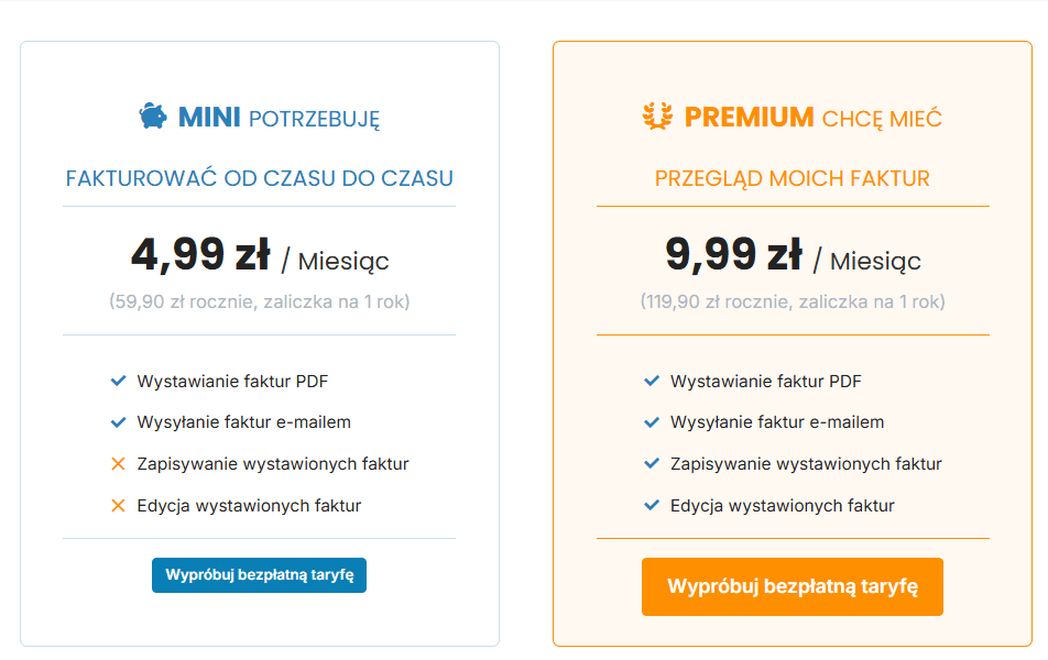 Zdecydowanie większy sens ma wybór pakietu premium, ponieważ nie spotkałem się z praktyką, aby płacić za program do faktur i nie mieć możliwości edycji faktur, oraz ich zapisywania, tak jak jest to w pakiecie mini.