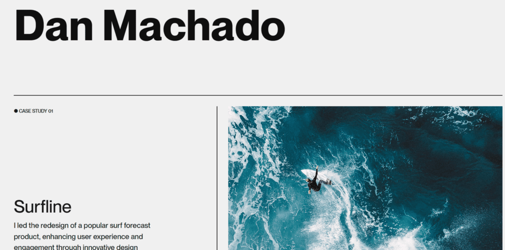 Dan Machado to projektant cyfrowy. Jego portfolio jest również bardzo dobre. Cechuje je prostota, duże zdjęcia oraz opisy każdego projektu jako studium przypadku.