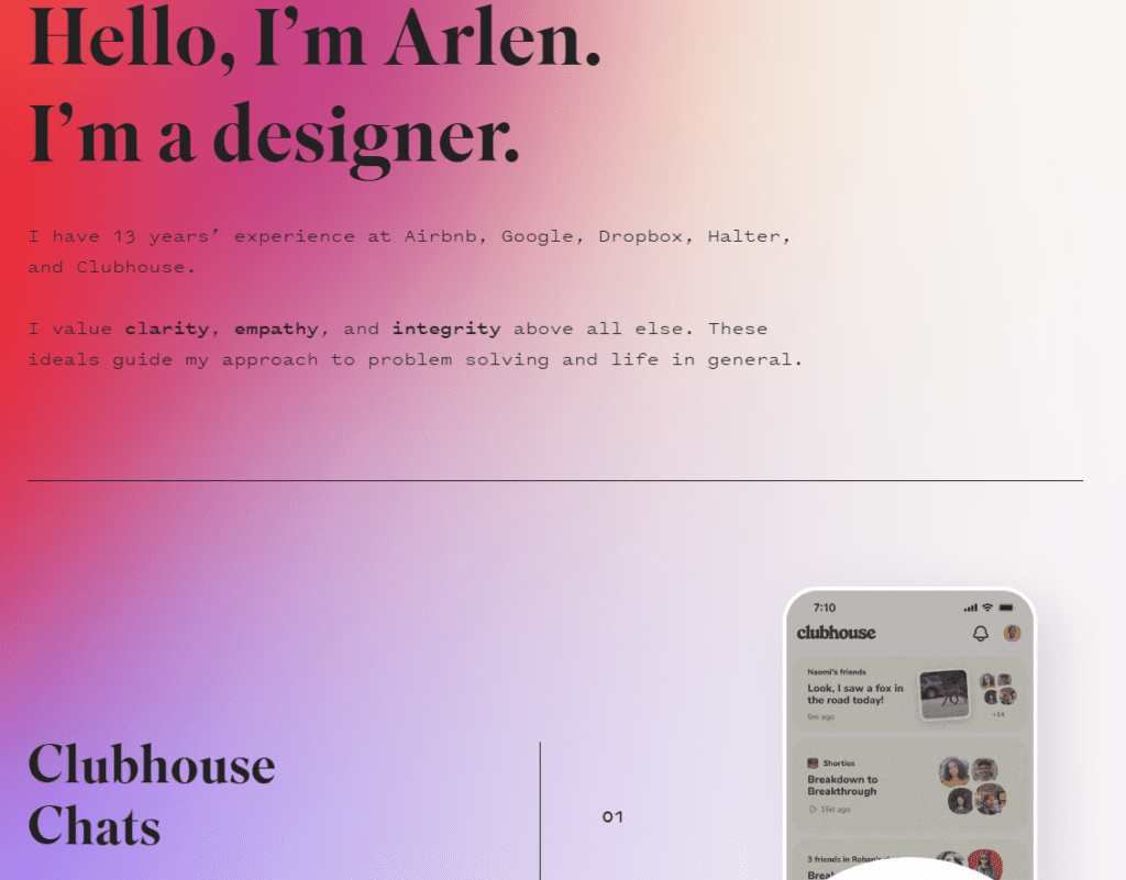 Strona z portfolio Arlena McLuskey jest banalna- u góry mamy krótki opis autora, a poniżej jego wcześniejsze projekty. Zdjęcia projektów są również w postaci gifów i można poczytać o nich więcej po kliknięciu.
