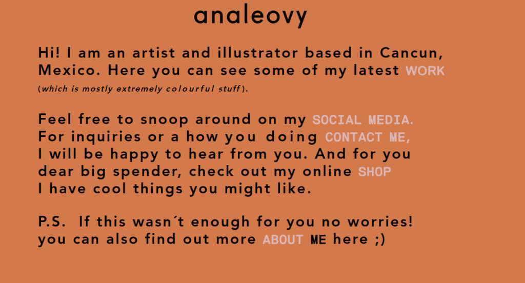 Strona z portfolio Any Leovy na pewno jest inne, niż wszystkie. Strona główna zawiera zarówno opis autorki, jak i linki do stron, między innymi linki do prac Any, czy profili w mediach społecznościowych.