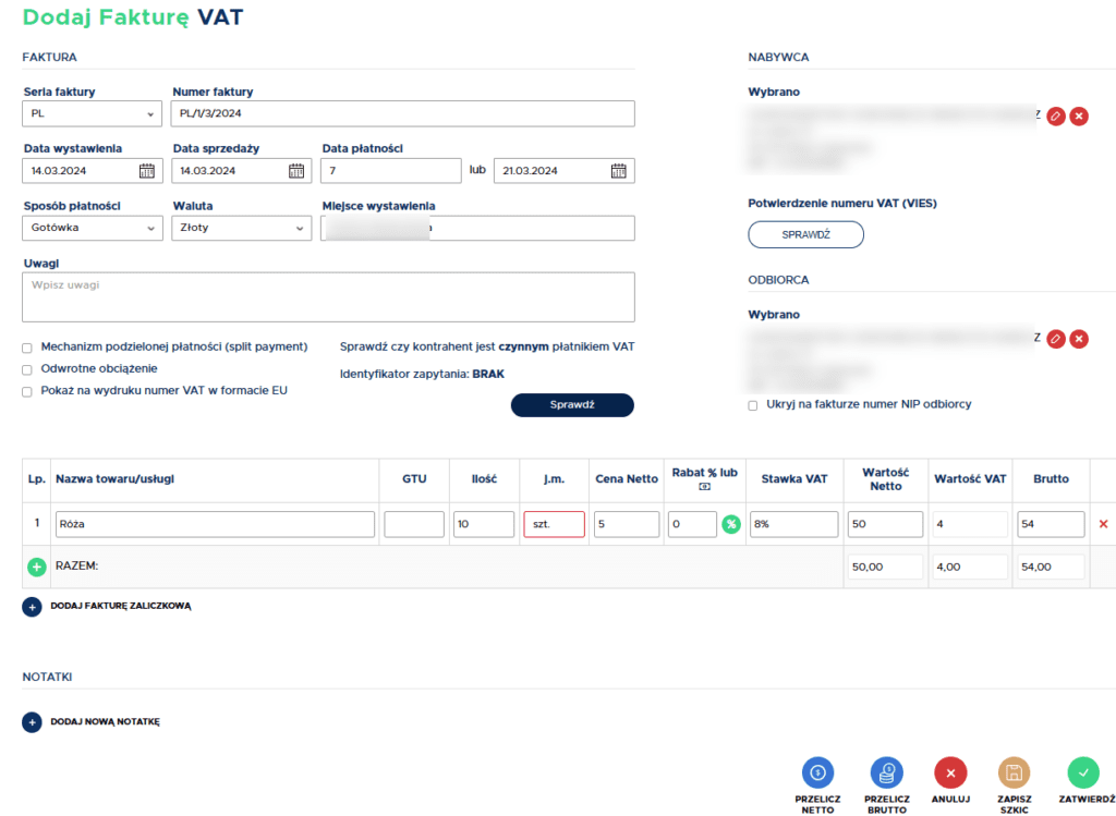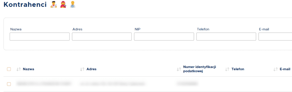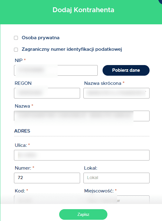 Dodawanie kontrahenta również jest proste, ponieważ po jego numerze NIP, jednym kliknięciem pobierzemy resztę danych jego firmy, a na koniec klient zapisze się w ewidencji, aby użyć go ponownie w kolejnych fakturach.