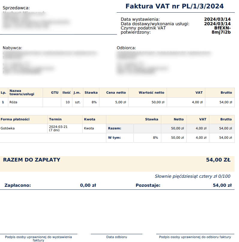 Nie ma możliwości żadnej konfiguracji wyglądu faktury, co jest minusem. Większość programów do faktur oferuje możliwość wgrania na fakturę logo firmy, zmianę szablonu, czcionek, lub kolorystyki.