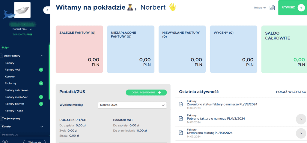 Po zalogowaniu się po lewej stronie widzimy menu, a w centralnej części zobaczymy nasze finanse, ostatnią aktywność oraz podatki do zapłaty. U góry umieszczono zielony przycisk „utwórz”, który jest skrótem do stworzenia faktury VAT.