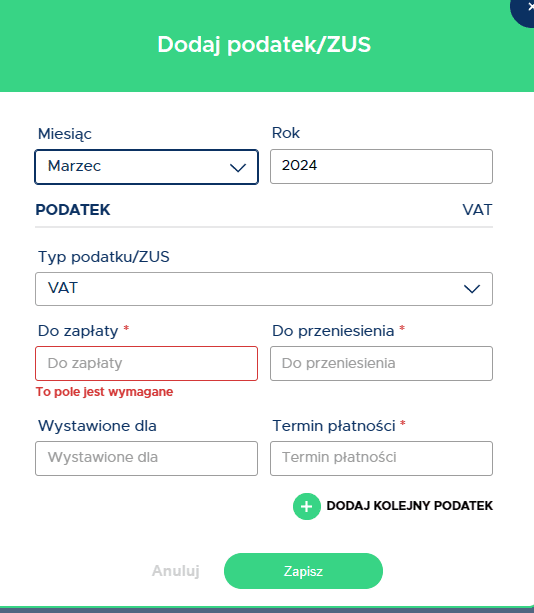 Przechodząc dalej, w zakładce „podatki/ZUS” wprowadzimy wysokości naszych opłat do uregulowania. Służy to jedynie przypominaniu nam o tych obowiązkach. Nie jest to żaden moduł księgowy. W Taxon nie ma żadnych funkcji księgowych, które swoją drogą powinny zostać wprowadzone.