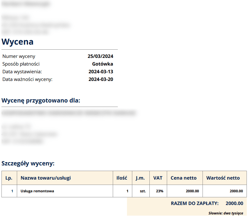 Po utworzeniu faktury, zapisuje się ona w systemie, po czym możemy ją wysłać klientowi na e-mail bezpośrednio z systemu Taxon, lub wydrukować. Druk prezentuje się jak poniżej.