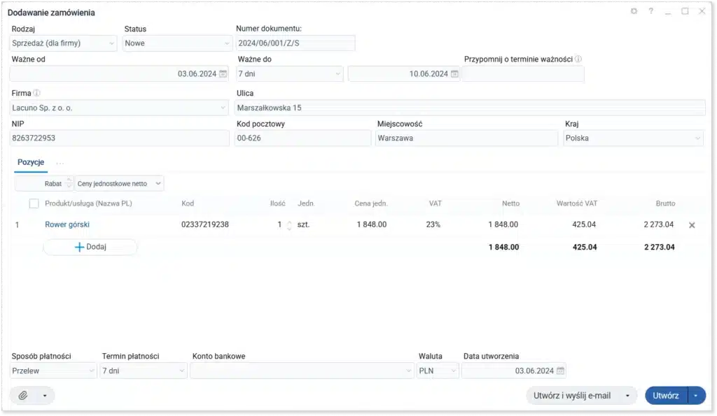 Tworzenie zamówień jest bardzo proste. Numer dokumentu zostaje nadany przez system. Automatycznie uzupełnią się również rubryki z datą i miejscem wystawienia oraz sprzedaży. Musisz jedynie podać dane nabywcy oraz uzupełnić pozycje na zamówieniu. Możesz ustalać rodzaj i termin płatności, dodawać np. notatkę prywatną czy dodatkowe uwagi do dokumentu.