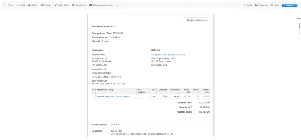 Zamówienie możesz wysłać e-mailem bezpośrednio z systemu Fakturownia, wydrukować, lub wyeksportować do formatu PDF. Z utworzonego zamówienia możesz również wygenerować bezpośrednio fakturę VAT.