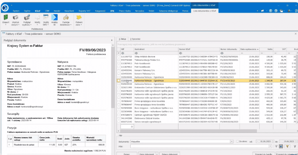 - Integracja z systemem KSeF– umożliwia bezpośrednią komunikację z Krajowym Systemem e-Faktur, co zapewnia zgodność z przepisami i usprawnia obieg dokumentów.