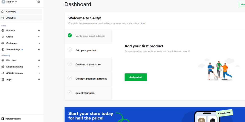 Po zarejestrowaniu się w Sellfy, naszym oczom ukaże się panel główny. Po lewej stronie znajdziemy wszelkie zakładki, a w centrum listę rzeczy do wykonania, by uruchomić sklep.
