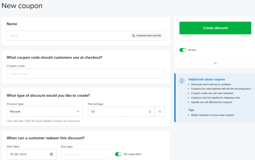 Na przykład masz możliwość tworzenia kuponów rabatowych i zniżek. Możesz generować dowolne kody rabatowe, oraz przypisywać do nich dane, takie jak wielkość zniżki, data wygaśnięcia, a także przypisywać do nich konkretne produkty.