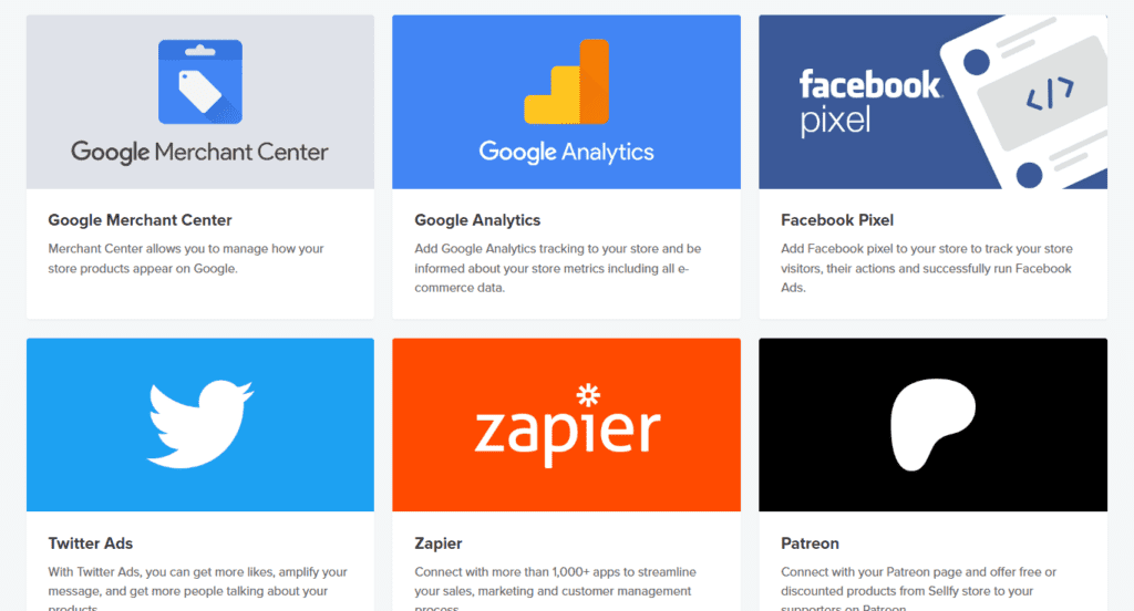 Nasz sklep Sellfy możemy zintegrować z kilkoma aplikacjami widocznymi na zdjęciu poniżej. Jak widać aplikacji jest tylko 6, co jest naprawdę niewielką liczbą. Zazwyczaj platformy e-commerce zintegrujemy z kilkudziesięcioma aplikacjami zewnętrznymi, dlatego to pole wymaga jeszcze poprawy.