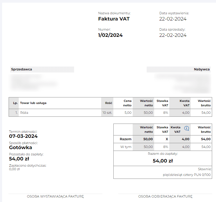 Jeżeli chodzi o wygląd faktury do druku, to prezentuje się ona tak jak poniżej.