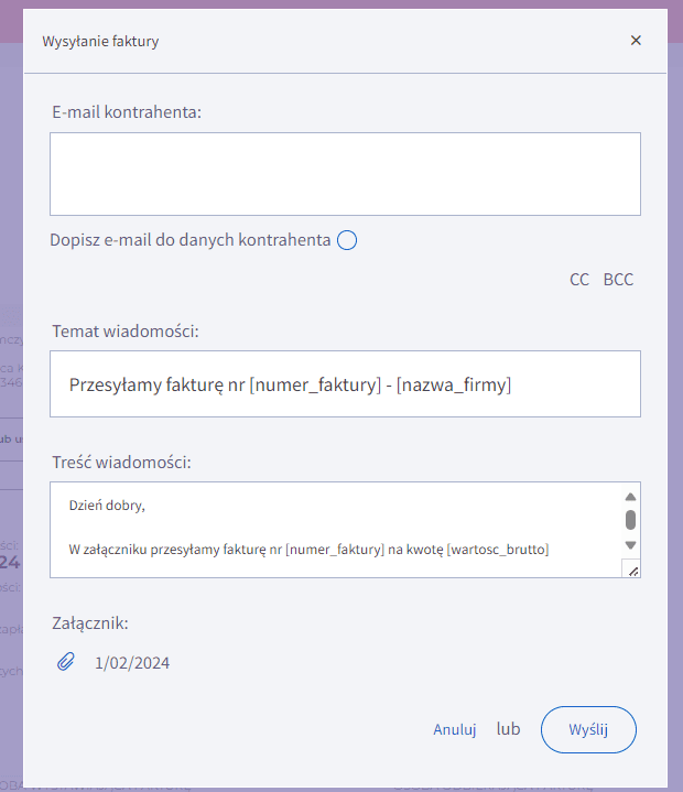 Po wygenerowaniu faktury, zapisze się ona w systemie. Dodatkowo możemy ją wysłać e-mailem do kontrahenta automatycznie z poziomu programu z możliwością dostosowania tematu i treści wiadomości.