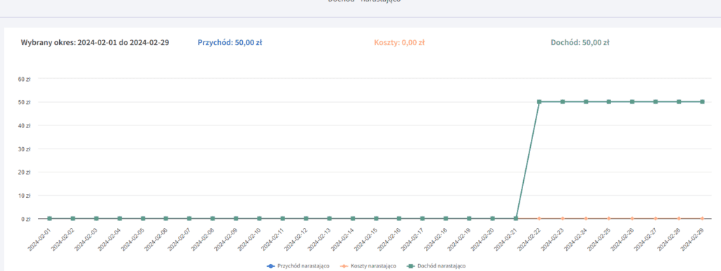Oprócz tego mamy również zakładkę ze statystykami, gdzie podejrzymy nasz przychód, dochód i koszty w wybranym czasie. Analizy te nie są tak rozbudowane jak w innych programach magazynowych i np. brakuje tu filtrów przychodów według kontrahentów