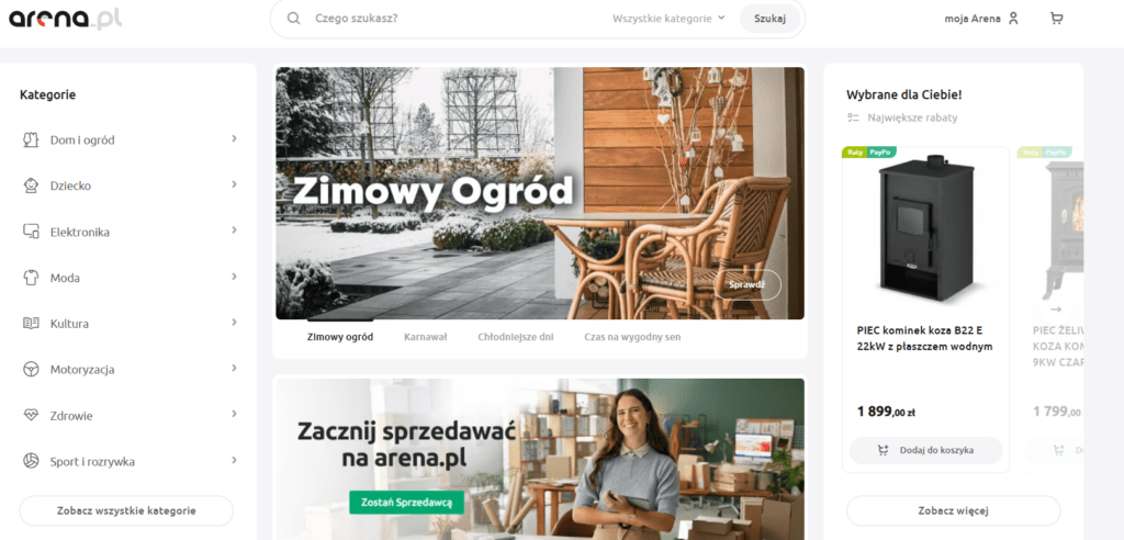 Jest tu zdecydowanie mniejsza konkurencja oraz opłaty transakcyjne. Z pewnością warto pomyśleć o Arena.pl, ponieważ próg wejścia jest niewielki. Mimo że firma jest mało znana, to jest notowana na GPW, a także zatrudnia fachowców z doświadczeniem w pracy w innych marketplace’ach.