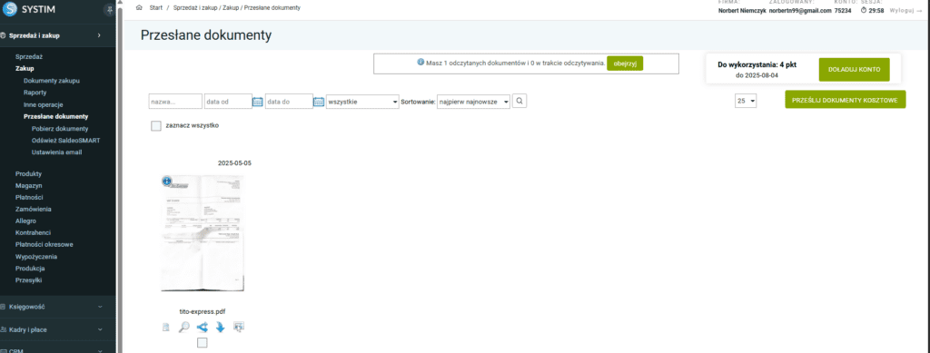 Aby zacząć korzystać z OCR, musimy przejść do sekcji „Sprzedaż i zakup–>Zakup–>Przesłane dokumenty”.