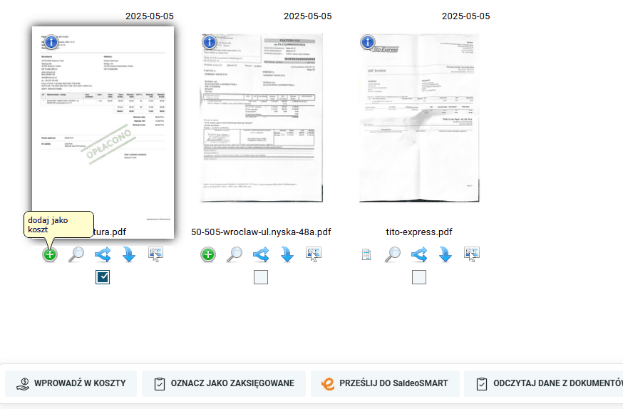 Jeżeli dodamy faktury do systemu, to aby zobaczyć, w jaki sposób zostały one odczytane, musimy wybrać fakturę, po czym kliknąć zielony przycisk „Dodaj jako koszt”.
