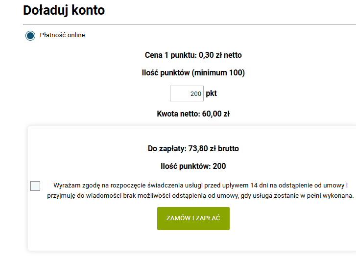 Jeżeli chcemy ich więcej, możemy je dokupić, klikając „doładuj konto”.