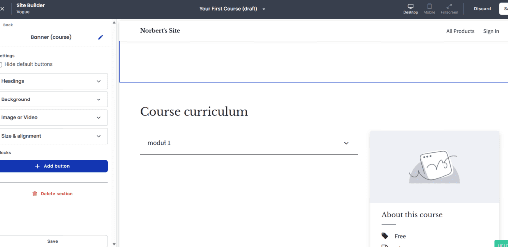 Thinkific posiada też wbudowany edytor stron lądujących. Działa to tak, że po utworzeniu kursu zostajesz przeniesiony do sekcji, w której możesz zbudować stronę, którą osoby zobaczą przed zakupem kursu.
